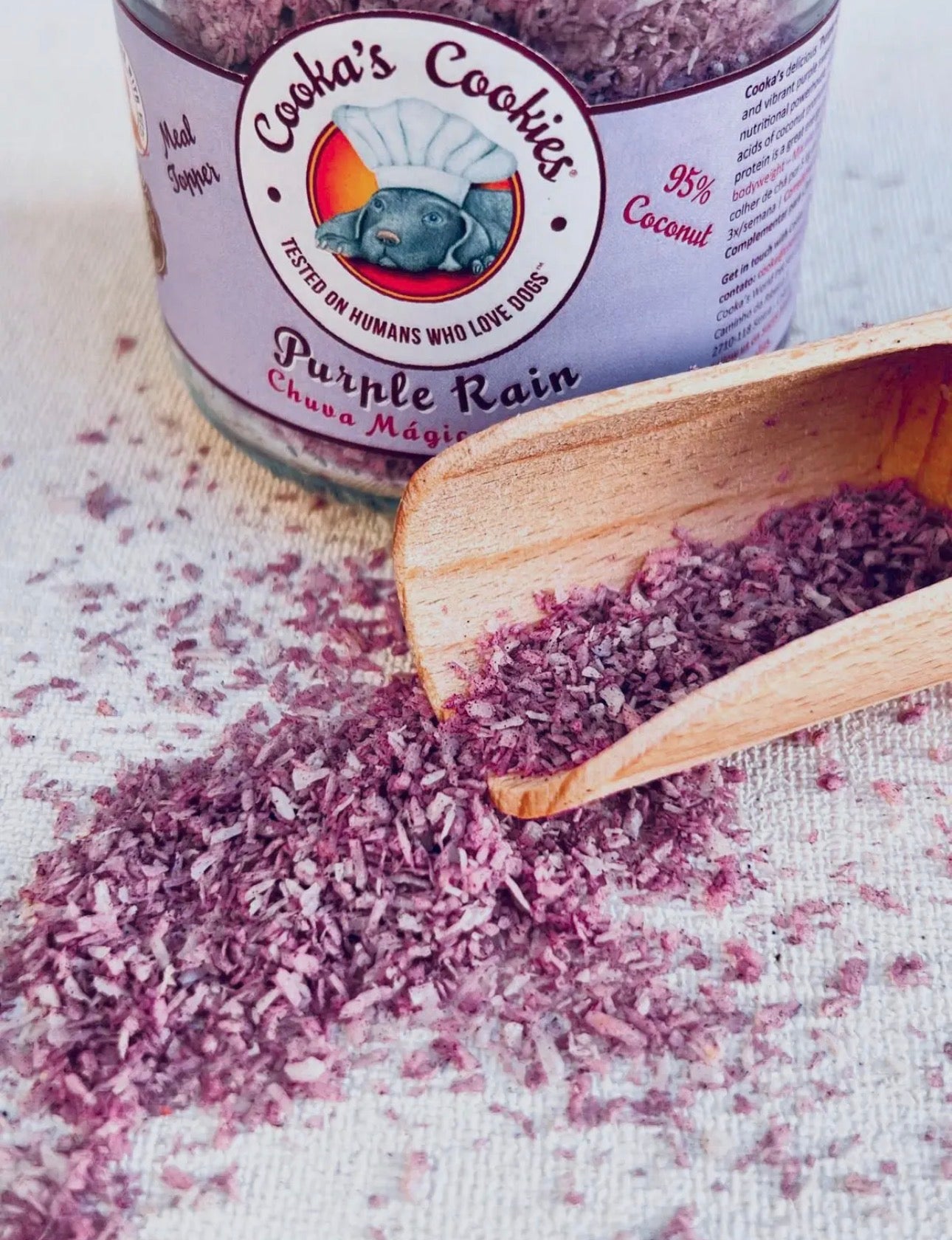 Purple Rain is een zachte maaltijdtopper van kokos en paarse zoete aardappel. Je gebruikt het eenvoudig door het over de maaltijd te strooien of te mengen met een beetje water tot een gladde pasta. De paarse zoete aardappel zit vol vezels en helpt de spijsvertering op een natuurlijke manier. Daarnaast bevat Purple Rain veel antioxidanten, zoals bètacaroteen en anthocyanen, die het immuunsysteem ondersteunen. Het is rijk aan vitamines en mineralen zoals calcium, kalium en ijzer, die bijdragen aan de algehele gezondheid van je hond.