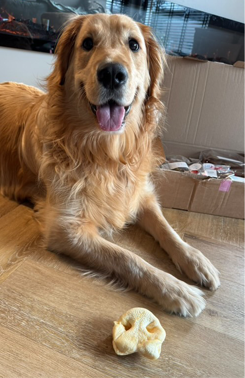 Onze hond Balou sprong al tegen het aanrecht op toen het pakketje binnenkwam. Toen de doos ook nog eens openging, pakte hij de honingneus als eerste. Niet veel later was hij opgesmikkeld! Wat fijn om je hond met een allergie toch zo te kunnen laten genieten!