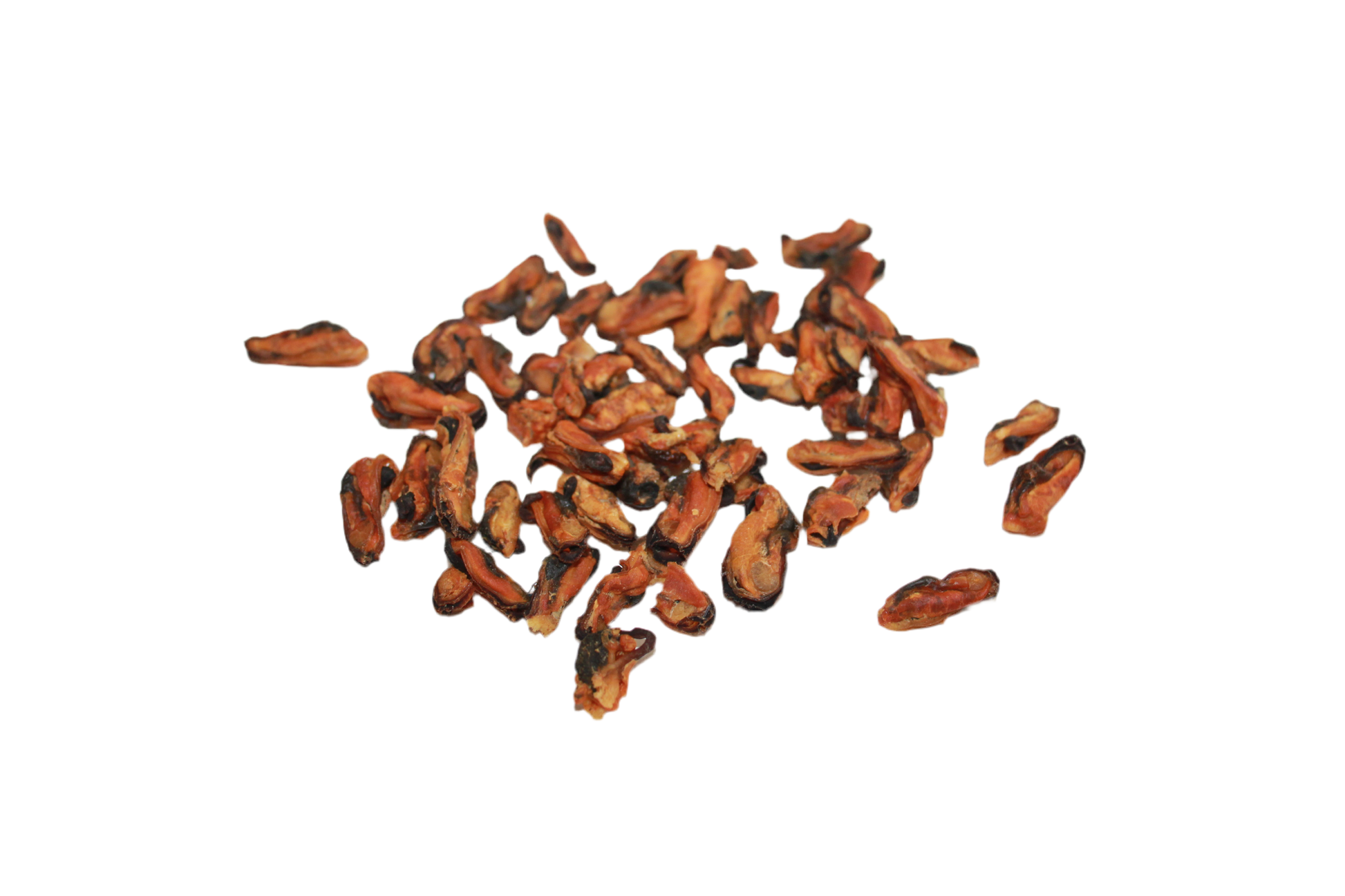 Deze hondensnack bestaat volledig uit gedroogde Zeeuwse mosselen, zorgvuldig gedroogd in Urk. De mosselen hebben een formaat van ongeveer 1 x 1 cm en een gewicht van 1 tot 2 gram per stuk.